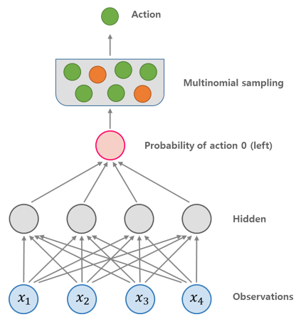 3. 출력된 확률에 따라 랜덤 하게 행동을 선택하여 수행한다.