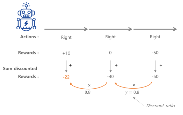 위의 그림에서 처럼 에이전트가 오른쪽으로 3번 이동하기로 결정했을 경우, 첫 번째 스텝에서 +10, 두 번째 스텝에서 0, 세 번째 스텝에서 -50의 보상을 받는다고 할 때, 할인 계수 γ=0.8을 적용하게 되면 첫 번째 행동의 전체 보상은 10+γ X 0 + γ^2 X (-50) = -22가 된다.