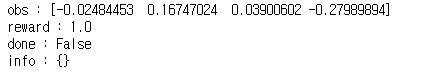 step() 메서드는 주어진 행동을 실행하고 obs, reward, done, info 4개의 값을 리턴한다.
