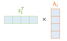 디코더 은닉 상태인 st를 전치(transpose)하고 각 은닉 상태와 내적(dot-product)을 수행한다. 예를 들어, st와 인코더의 i번째 은닉 상태의 어텐션 스코어 계산 모습은 아래와 같다.