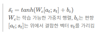 어텐션 값이 구해지면 at를 st와 결합(concatenate)하여 하나의 벡터로 만드는 작업을 수행하며, 이를 로 정의합니다. 는 예측 연산의 입력으로 사용하여 인코더로부터 얻은 정보를 활용해 를 좀 더 잘 예측할 수 있게 한다.