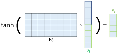 어텐션 매커니즘에선 위에서 구한 를 바로 출력층으로 보내지 않고 그 전에 신경망 연산을 추가. 가중치 행렬과 곱한 후 하이퍼볼릭탄젠트 함수를 지나도록 하여 출력층 연산을 위한 새로운 벡터인 를 얻을 수 있다.