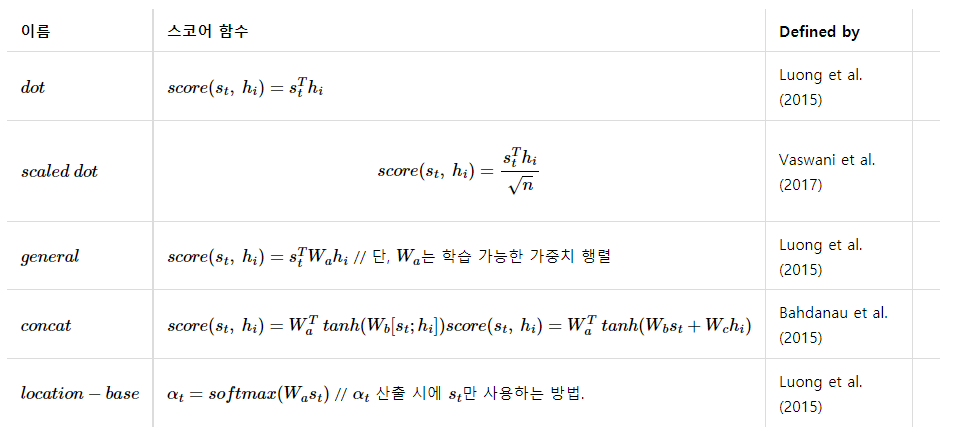 어텐션의 종류는 다양하다. 어텐션 차이는 중간 수식인 어텐션 스코어 함수 차이를 말하는데, 위에서 살펴본 것은 내적을 사용한 닷-프로덕트 어텐션이었다.